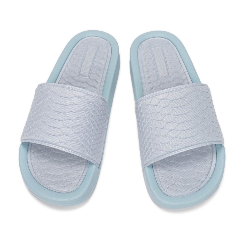 Cureaua lată care susține piciorul este realizată din material soft shell, ceea ce face ca șlapii să fie extrem de confortabili. În plus, cureaua este decorată cu relief subtil care imită pielea de șarpe, oferind întregului aspect un aspect elegant și modern. Flip-flops au un vârf rotund și deschis, care asigură respirabilitate și confort în zilele mai calde.