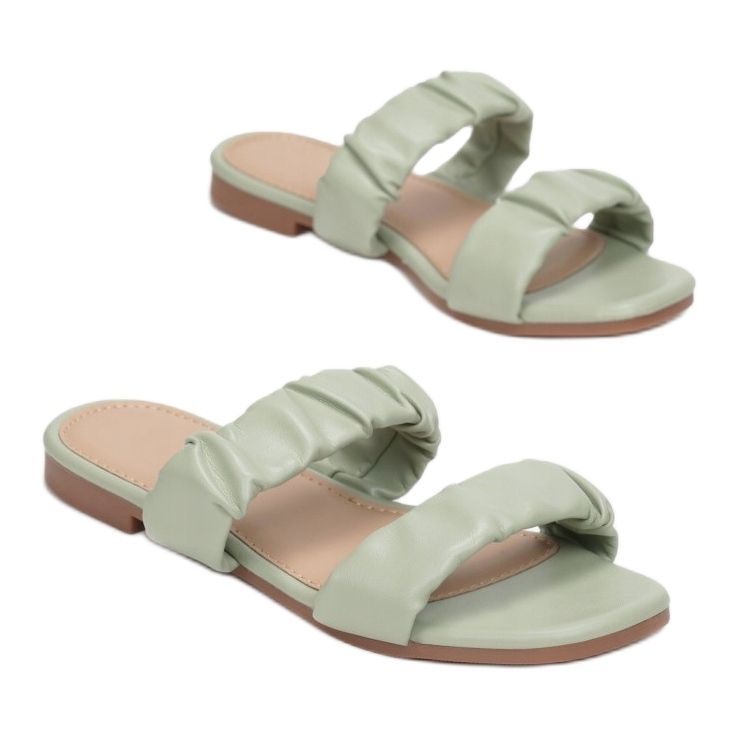 Flip-flops se caracterizează prin două bretele simple care susțin piciorul, care sunt decorate cu încrețituri delicate - acest lucru face ca acești pantofi să iasă în evidență prin stilul lor original. Degetul deschis, ușor pătrat și călcâiul expus adaugă eleganță și asigură aerisirea perfectă a picioarelor, ceea ce este important în zilele mai calde.