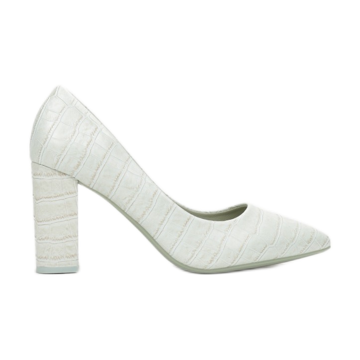 Așezați pe un toc stabil de 8,5 cm înălțime, pantofii nu numai că vă lungesc picioarele, ci adaugă și încredere în sine. Un accent interesant este embosarea din piele de crocodil, care conferă încălțămintei un caracter original – atât pe suprafața exterioară, cât și pe călcâi.