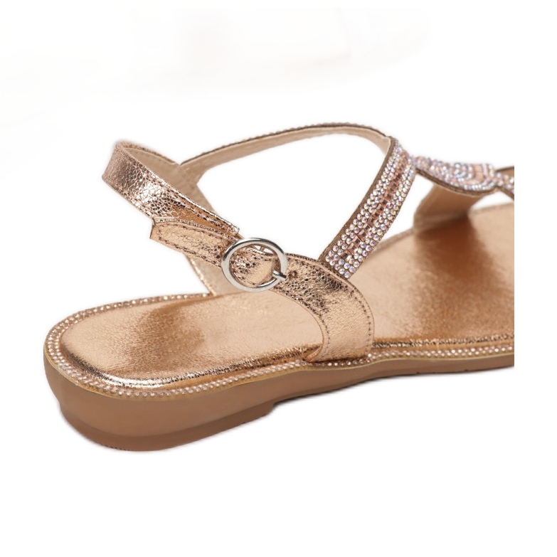 Va oferim sandale Vices Q-93-449 aurii, care sunt combinatia perfecta de stil si confort. Aceste sandale elegante cu pană foarte joasă, de 2 cm înălțime, sunt o alegere perfectă pentru zilele călduroase. Datorită cataramei, sandalele țin perfect piciorul la degete, mijlocul piciorului și călcâi, asigurând încredere și confort la mers.