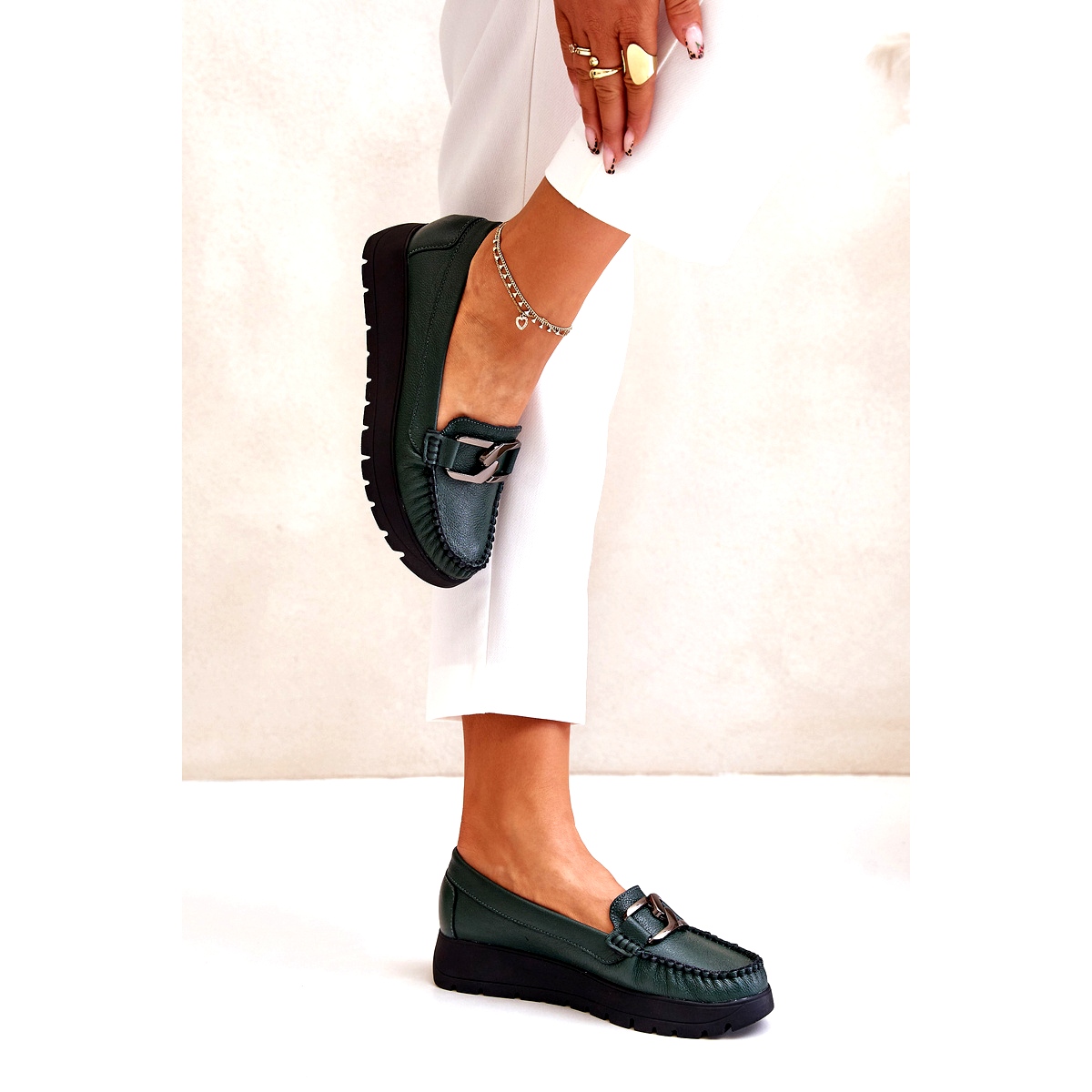 Detalii: Zazoo 10141 Mocasini De Piele Pe O Platforma Cu Decorat, Verde Inchis